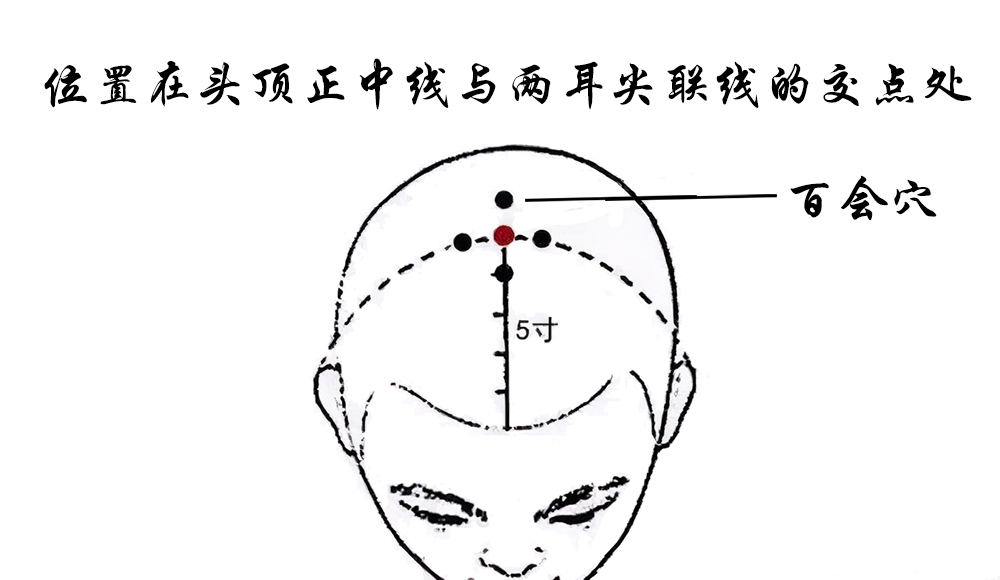 4、百会穴:是人体的重要大穴之一,位置在头顶正中间,如果用两条线衡量的话,就是头顶中间的一条线和两边耳尖连成的线交叉的点就是百会穴了。百会穴是调节身体阴阳的重要穴位,对于失眠、头痛、眩晕、高血压等情况有很好的治疗作用,同时还可以治疗脱肛、休克等疾病。每天揉按百会穴不仅能够缓解失眠,还能起到连贯周身穴位,调理身体健康的作用。