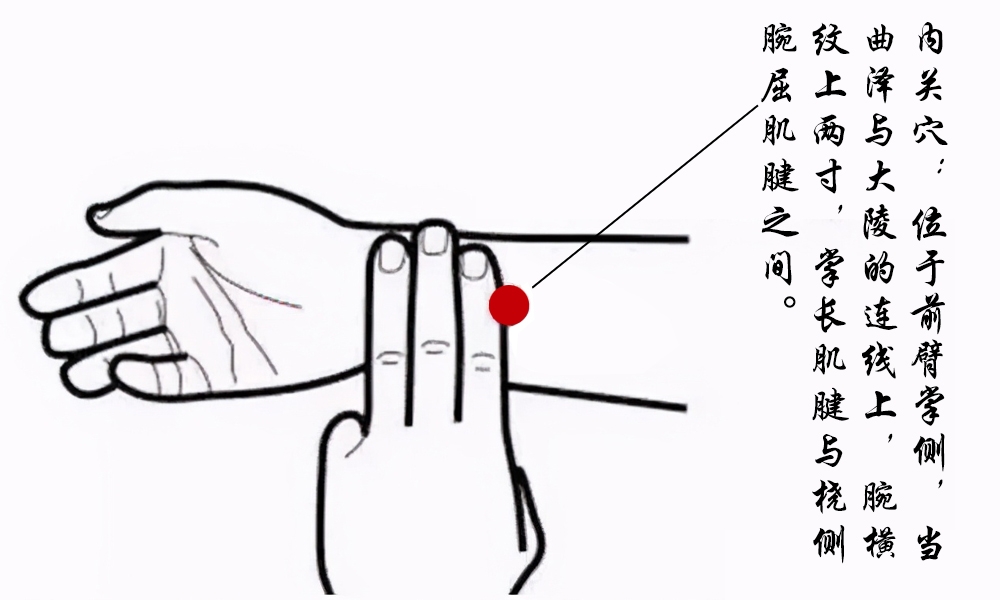 四、内关穴,也称养护心脏穴:按揉内关穴有助于血气畅通,用大拇指垂直往下按,每次按揉3分钟左右,直至局部感到酸麻。除了保护心脏,内关穴还是个救急的穴位,在病人突发心脏病时,先让病人平躺,在等待急救期间,配合按揉内关穴可起到缓解疼痛的效果。此外,按揉内关穴还能缓解头疼、口干、嗓子疼、颈椎病、肩周炎、腰部疼痛等病症。